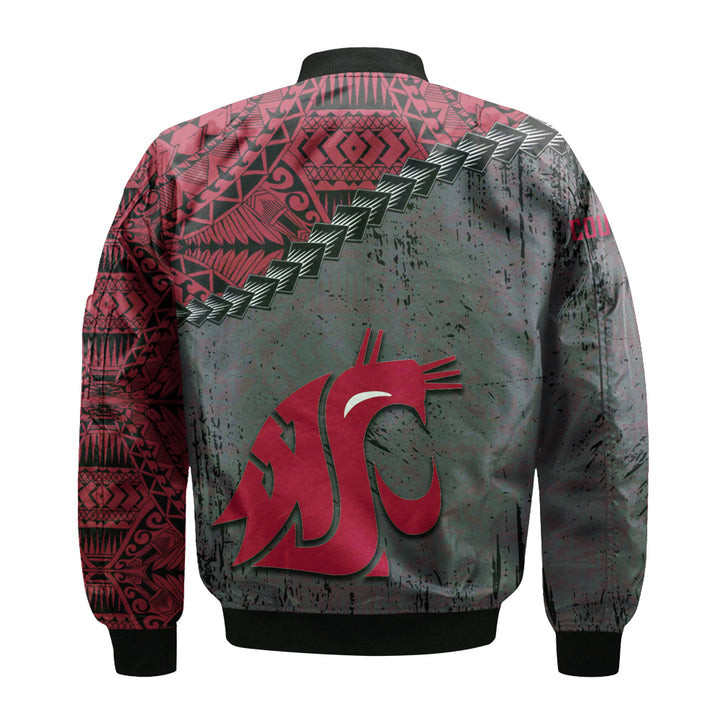 Washington State Cougars Red Grey Grunge Polynesian Tatto Bomber Jacket | NCAA College Team Jacket for Men & Women | Sports Fan Gift