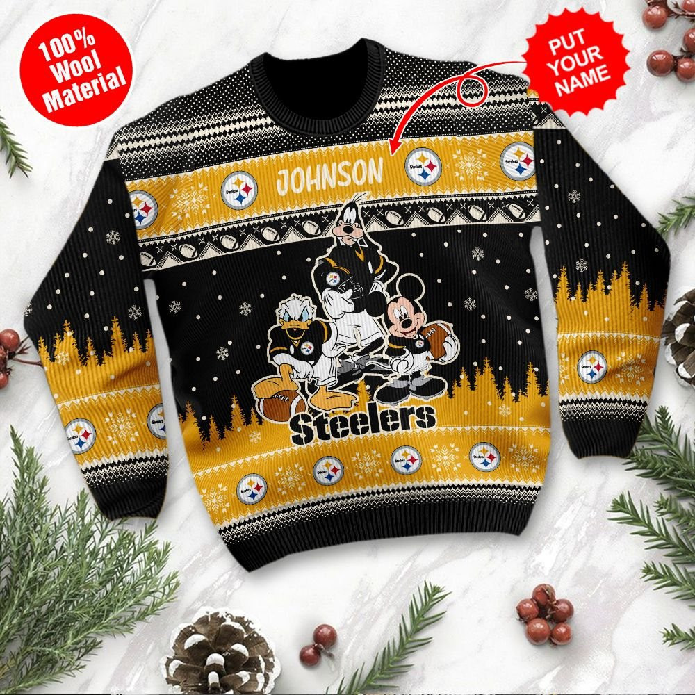 Pittsburgh Steelers Disney Donald Duck Mickey Mouse Goofy Personalized Ugly Christmas Sweater, Perfect Holiday Gift