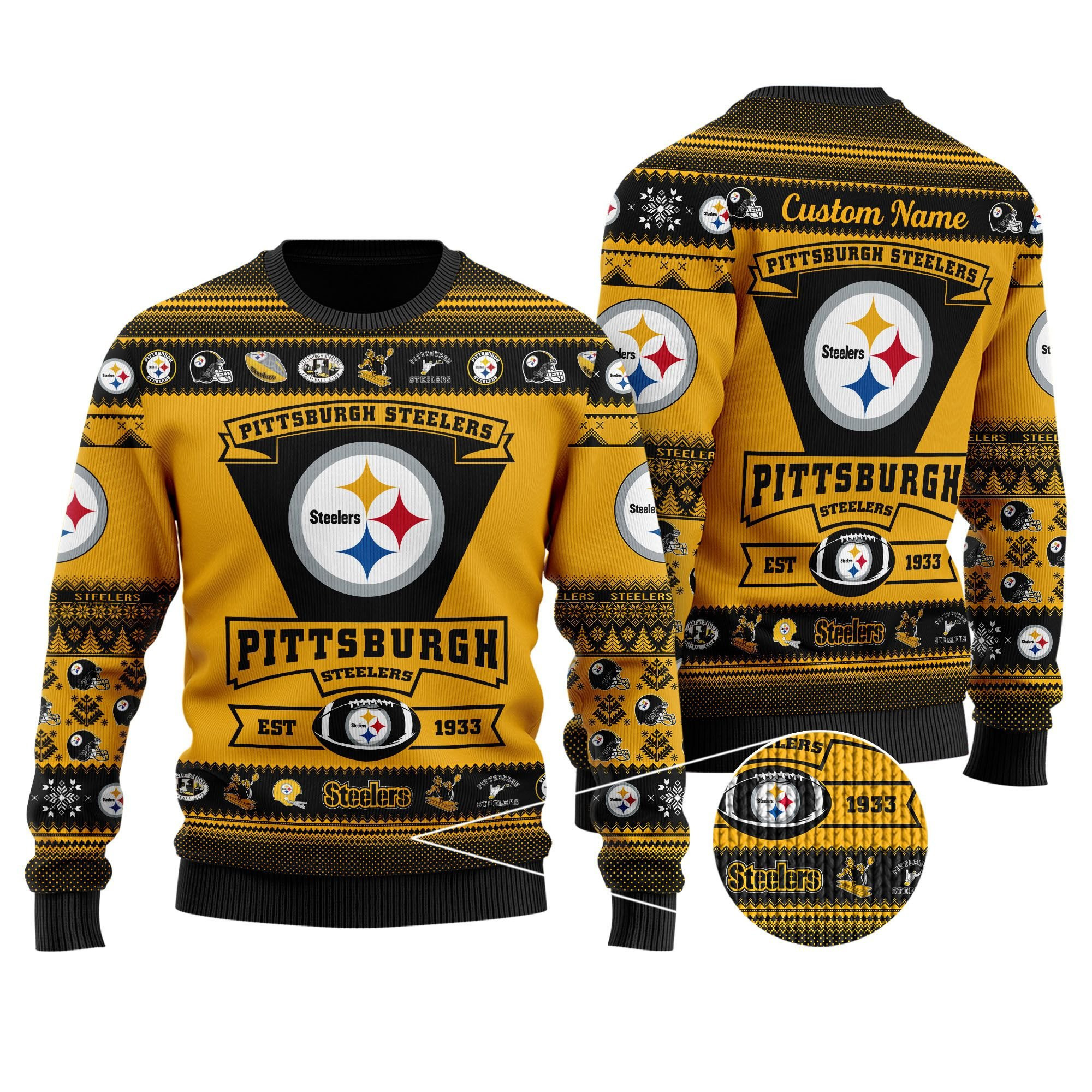 Pittsburgh Steelers Football Team Logo Custom Name Personalized Ugly Christmas Sweater Holiday Party Men Women Plus Size