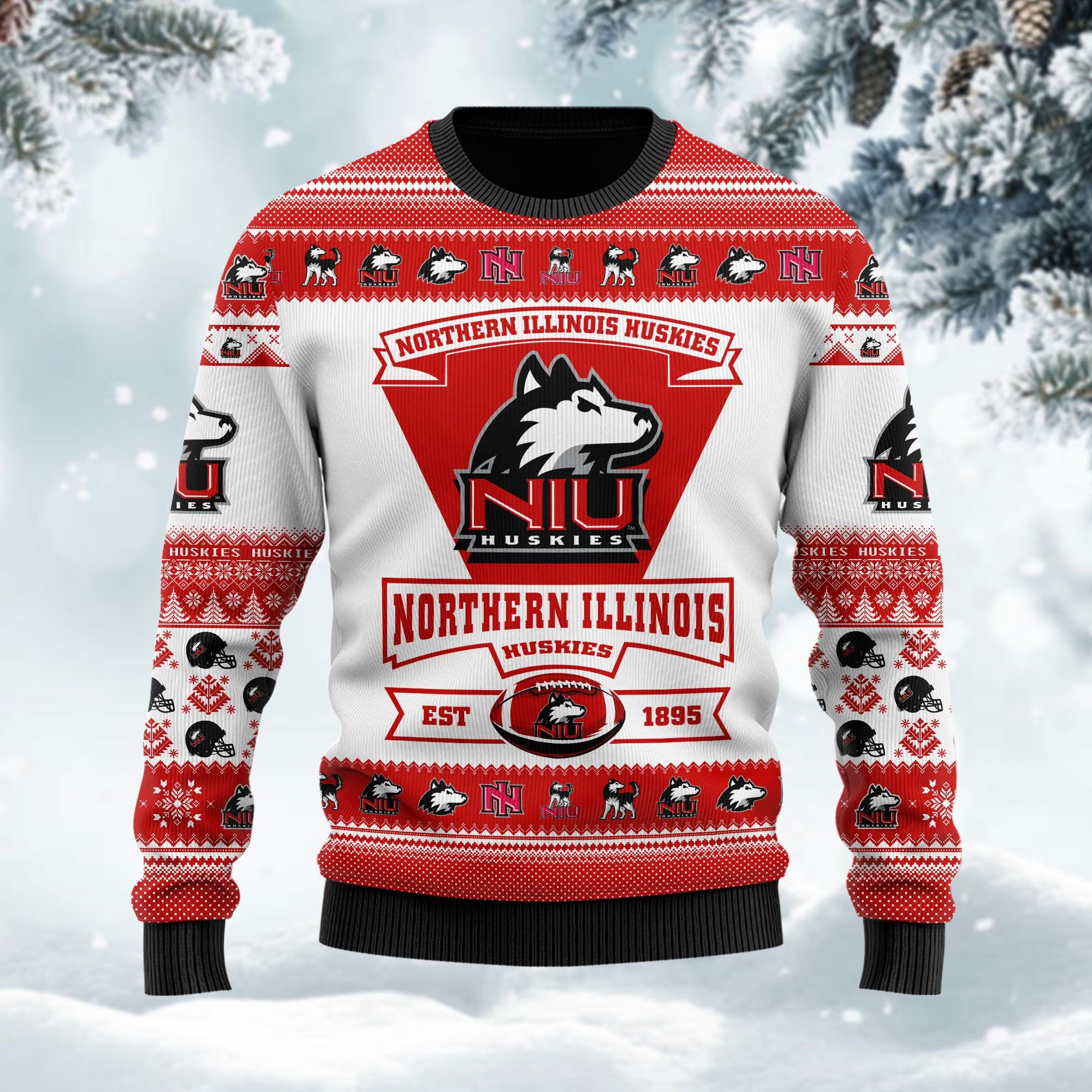 Northern Illinois Huskies Football Team Logo Custom Name Personalized Ugly Christmas Sweater Holiday Party Men Women Plus Size
