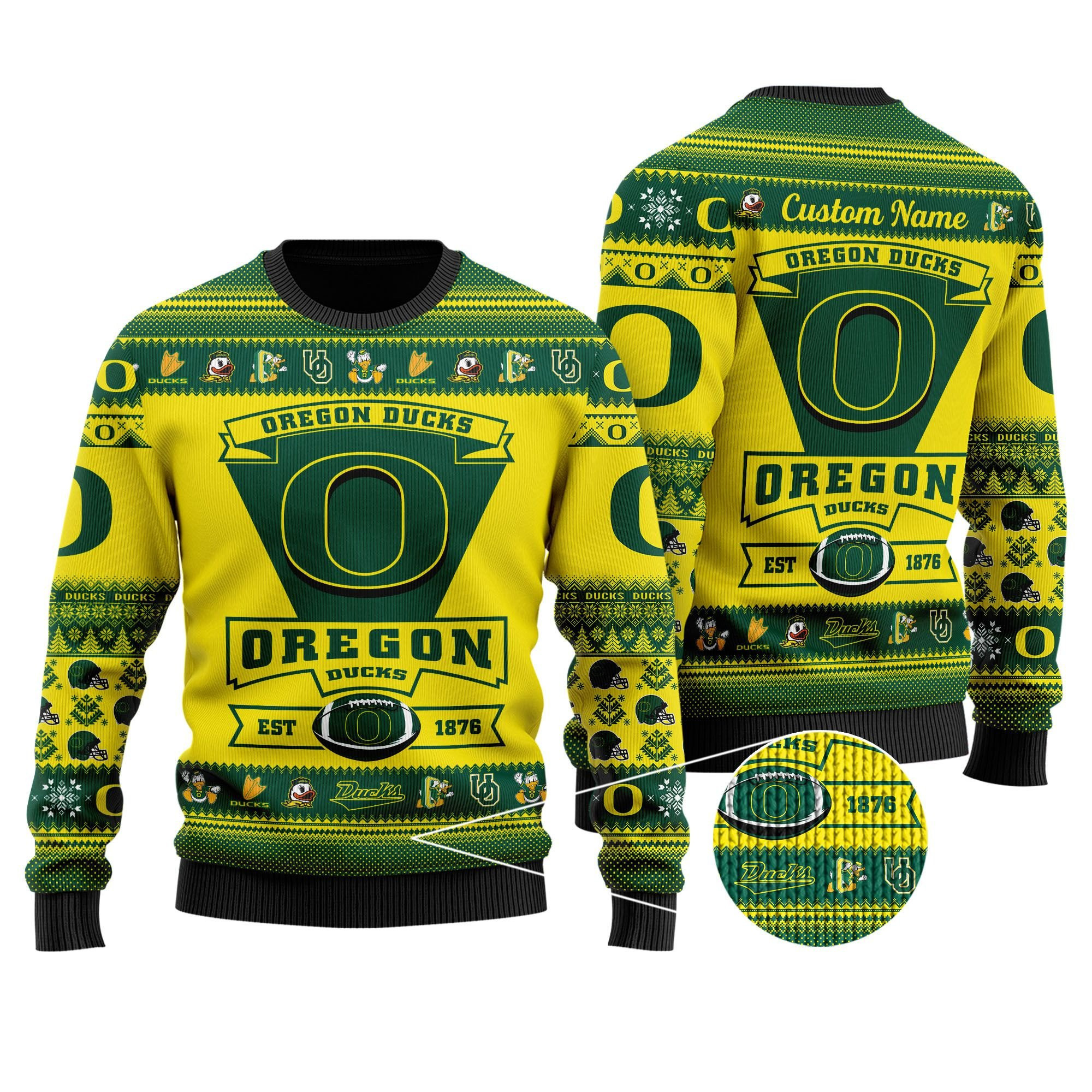 Oregon Ducks Football Team Logo Custom Name Personalized Ugly Christmas Sweater Holiday Party Men Women Plus Size
