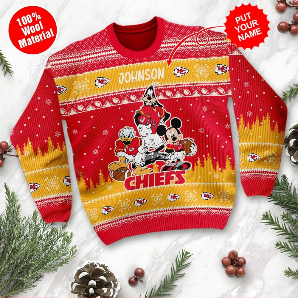 Kansas City Chiefs Disney Donald Duck Mickey Mouse Goofy Personalized Ugly Christmas Sweater, Perfect Holiday Gift