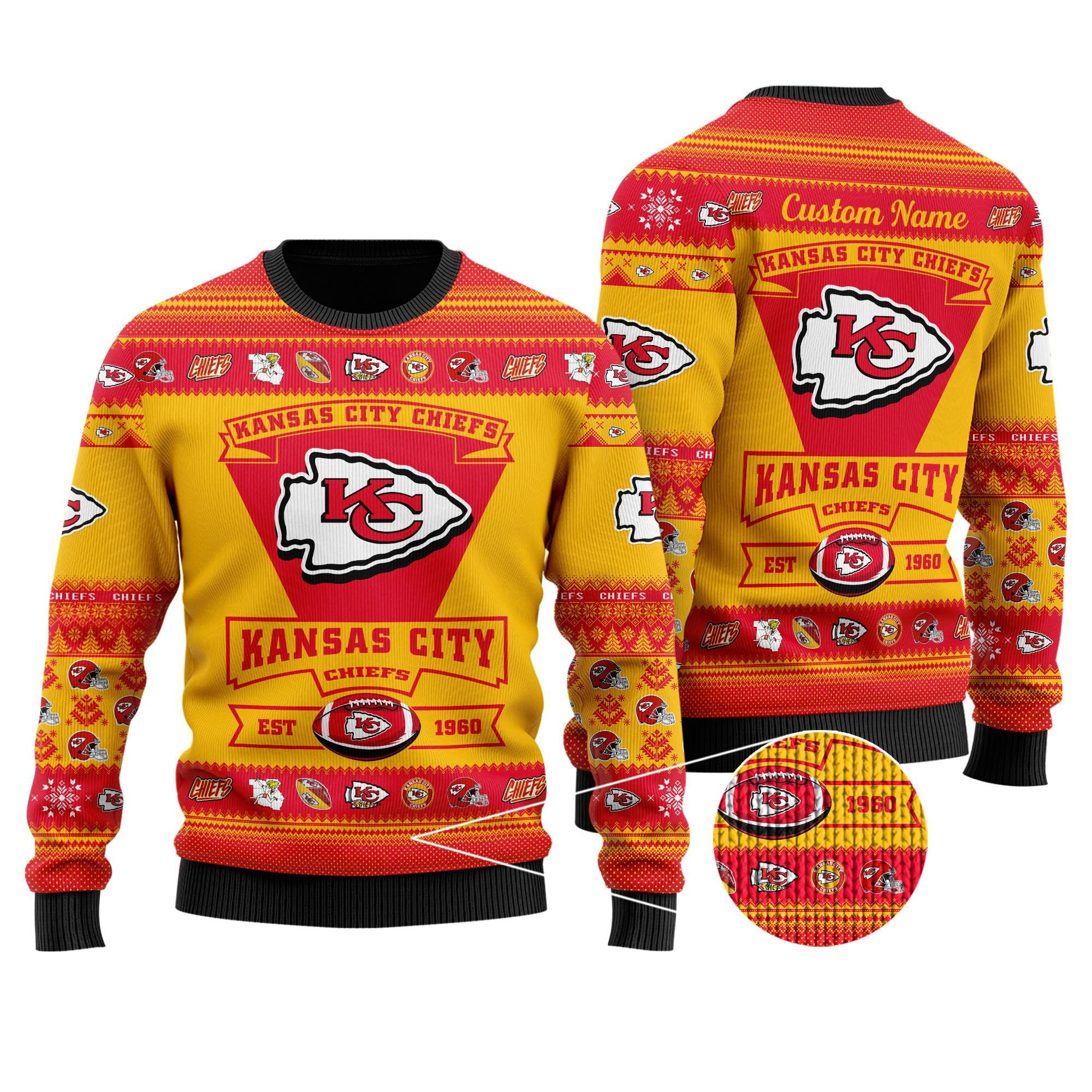 Kansas City Chiefs Football Team Logo Custom Name Personalized Ugly Christmas Sweater Holiday Party Men Women Plus Size