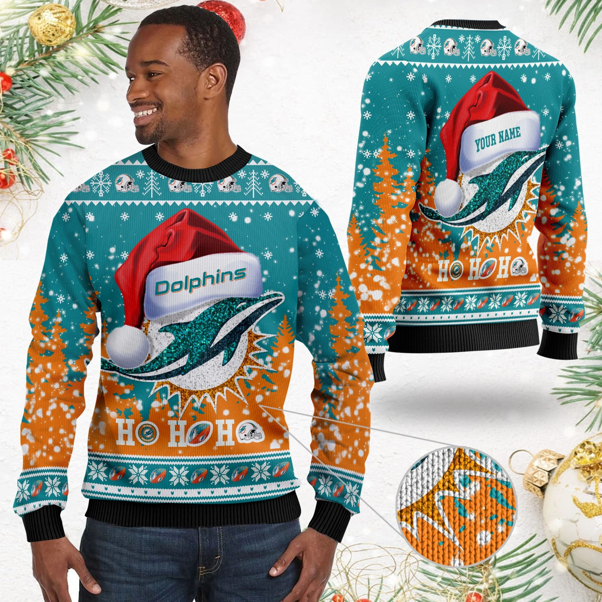 Miami Dolphins Symbol Wearing Santa Claus Hat Ho Ho Ho Custom Personalized Ugly Christmas Sweater Perfect Holiday Gift
