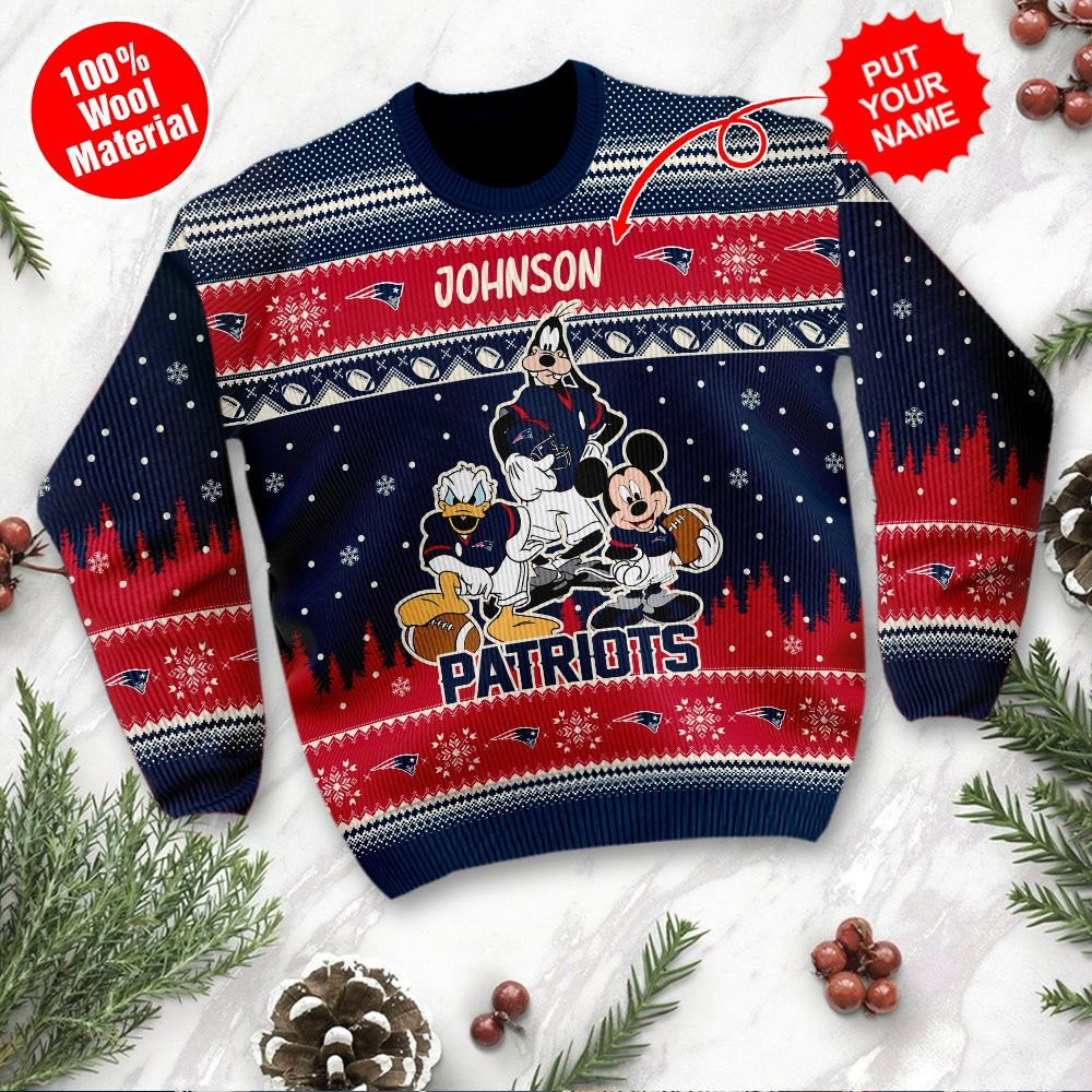 New England Patriots Disney Donald Duck Mickey Mouse Goofy Personalized Ugly Christmas Sweater, Perfect Holiday Gift