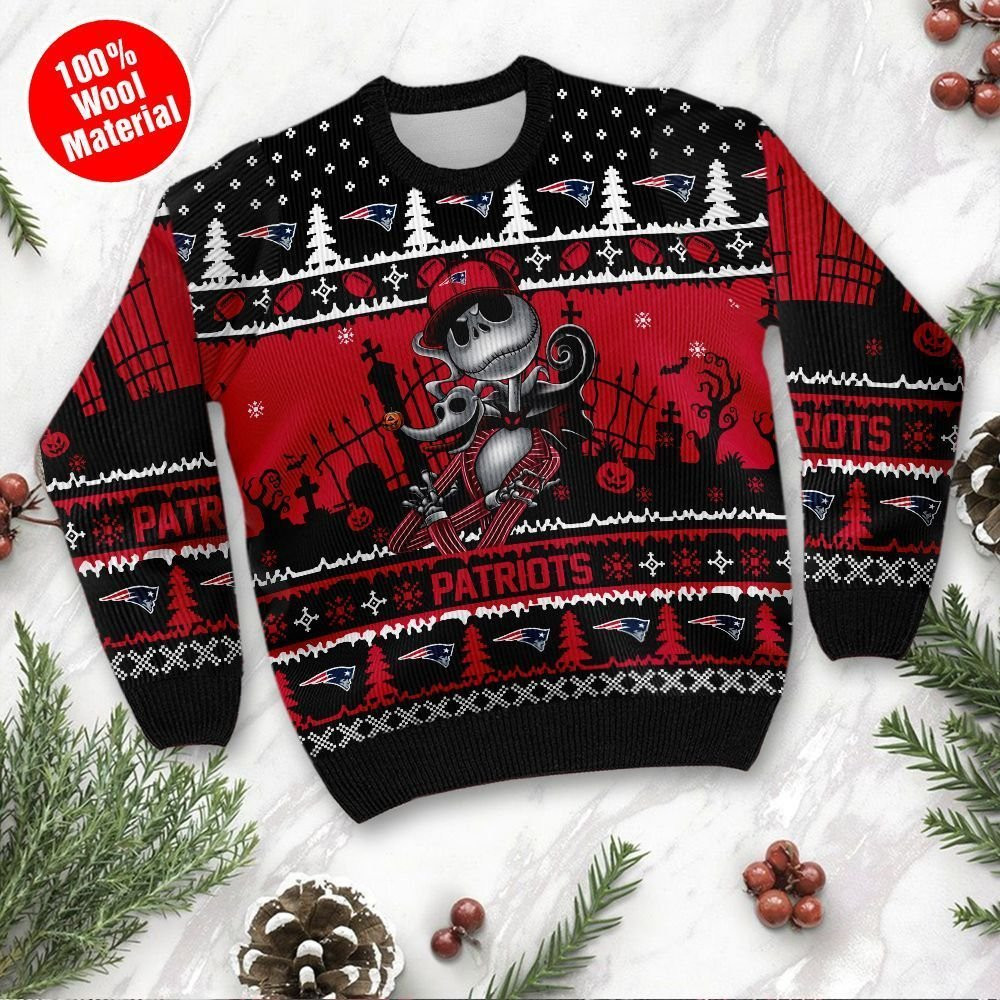 New England Patriots Jack Skellington Halloween Holiday Party Ugly Christmas Sweater, Perfect Holiday Gift