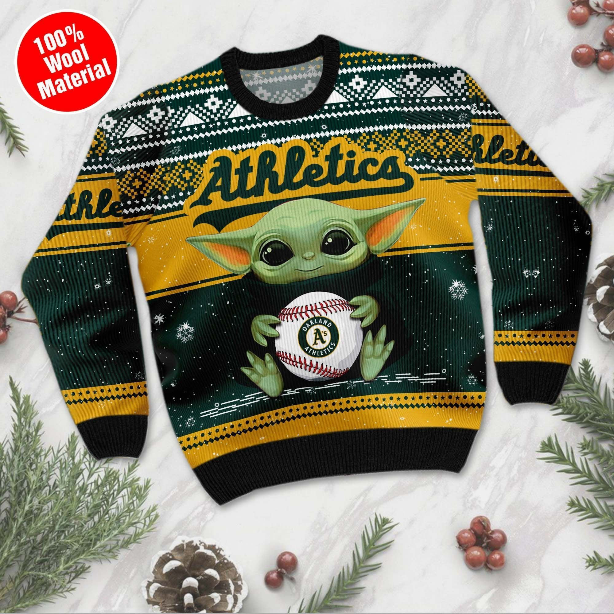 Oakland Athletics Grogu Baby Yoda Hug Logo Ugly Christmas Sweater, Perfect Holiday Gift