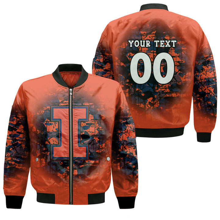 Illinois Fighting Illini Personalized Text Number Orange Blue Bomber Jacket | NCAA College Team Jacket for Men & Women | Sports Fan Gift