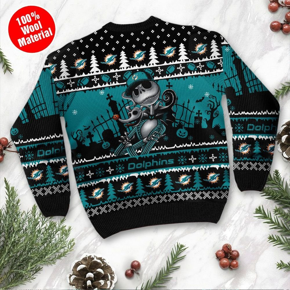 Impress your family and friends with a distinctive blend of style and humor. Our Miami Dolphins Jack Skellington Halloween Holiday Party Ugly Christmas Sweater, Perfect Holiday Gift go beyond mere apparel; they embody a tradition that sparks joy and creates enduring memories. Embrace the festive spirit with these vibrant polyester masterpieces – the perfect choice to make this holiday season memorable for all those seeking festive clothing treasures.