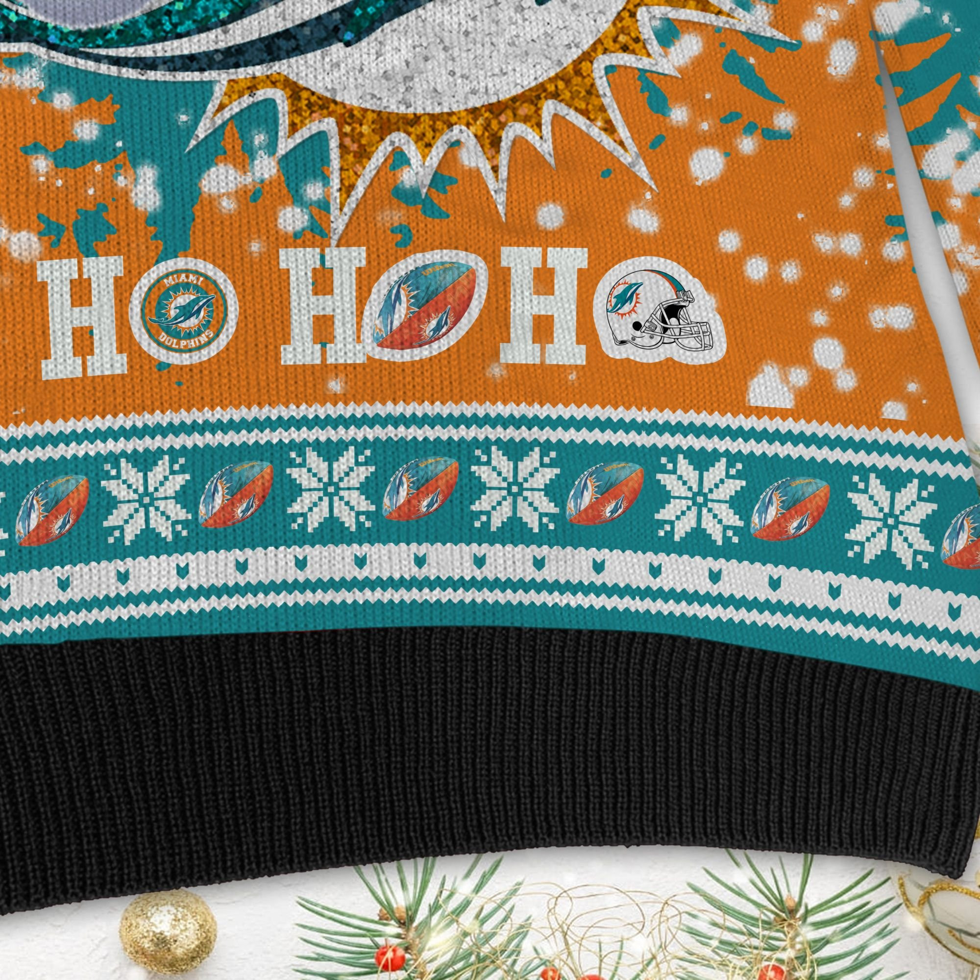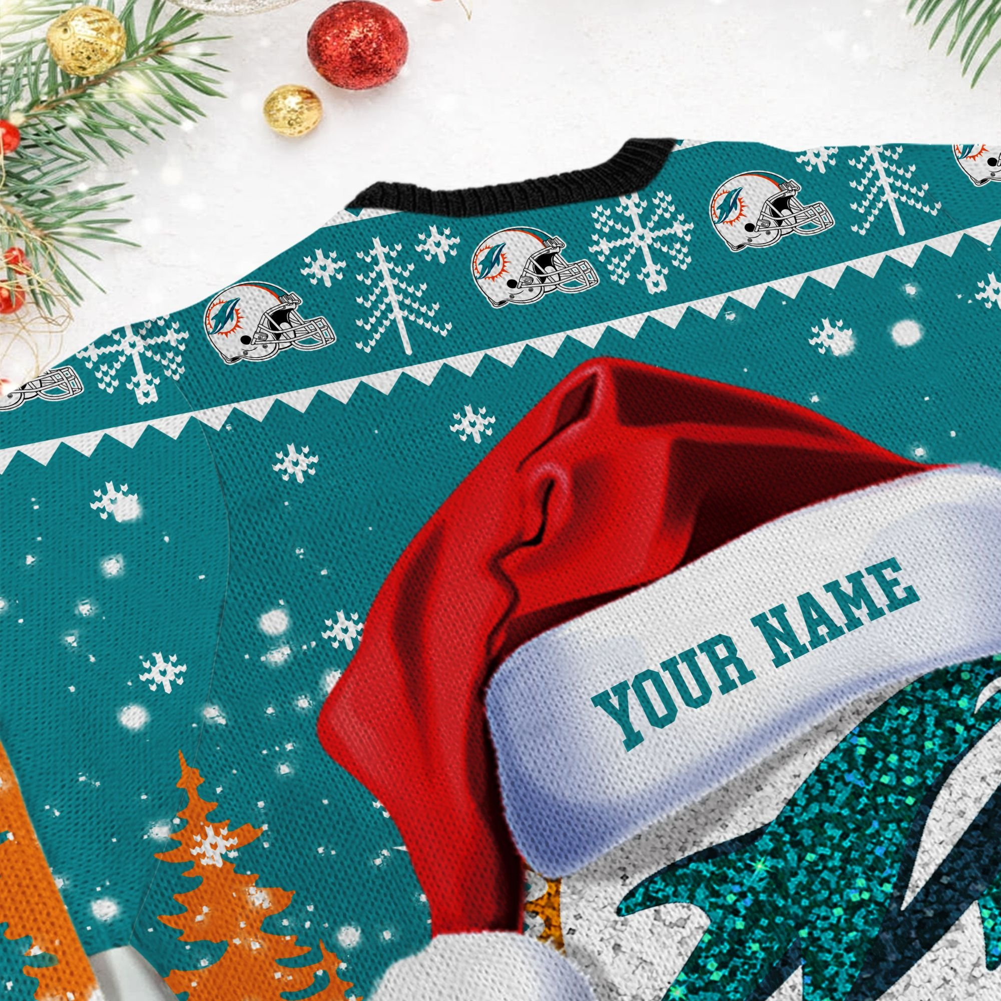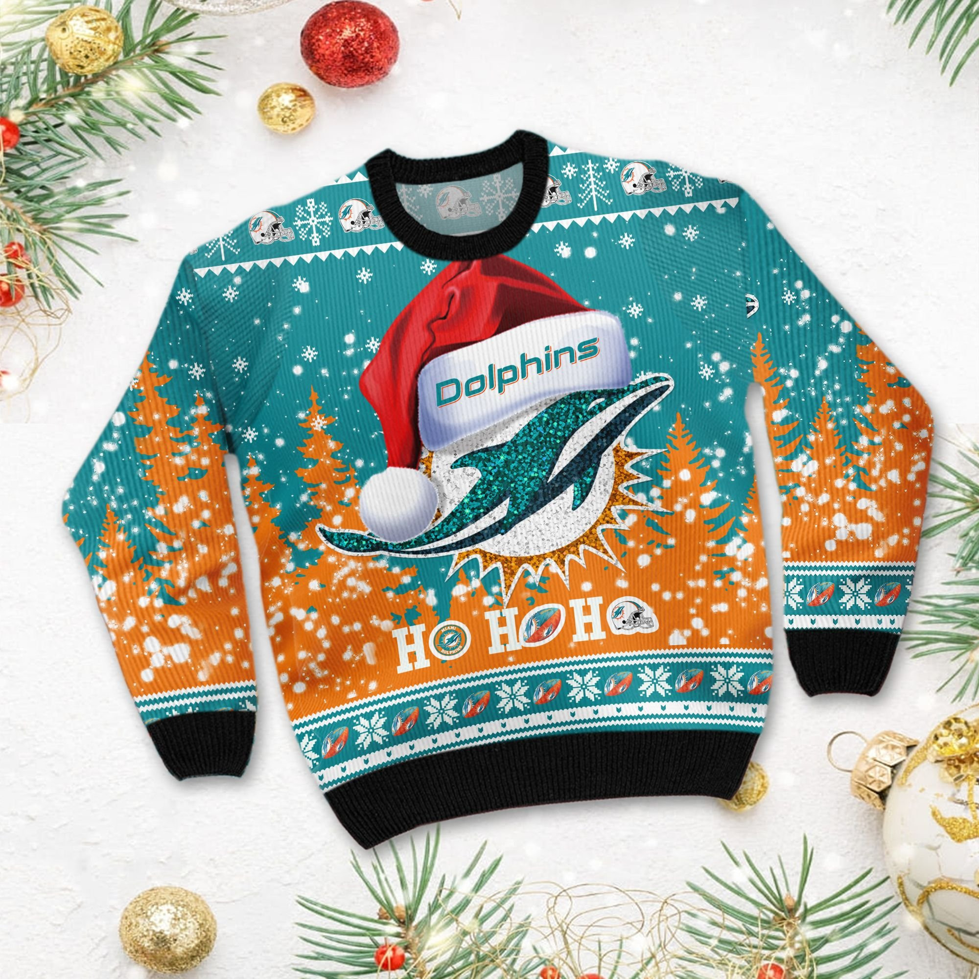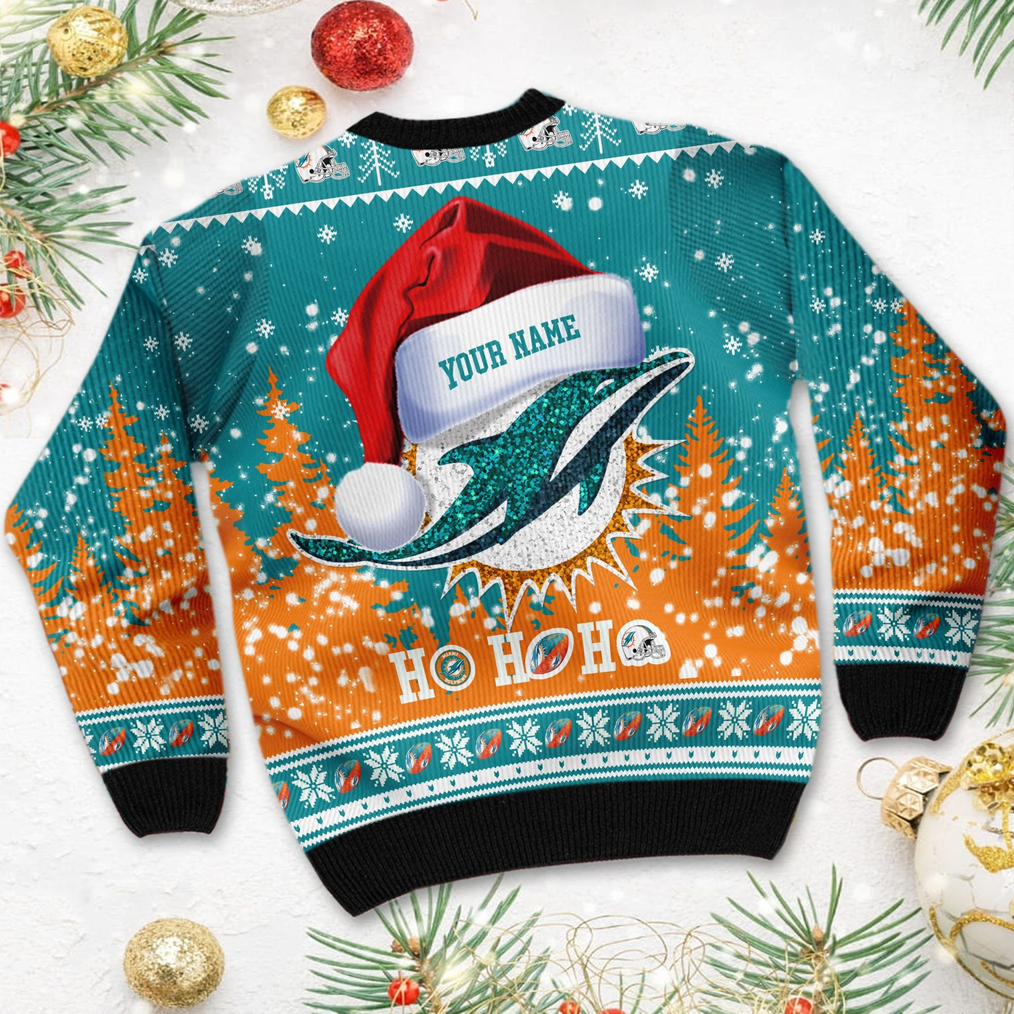 Impress your family and friends with a distinctive blend of style and humor. Our Miami Dolphins Symbol Wearing Santa Claus Hat Ho Ho Ho Custom Personalized Ugly Christmas Sweater, Perfect Holiday Gift go beyond mere apparel; they embody a tradition that sparks joy and creates enduring memories. Embrace the festive spirit with these vibrant polyester masterpieces – the perfect choice to make this holiday season memorable for all those seeking festive clothing treasures.