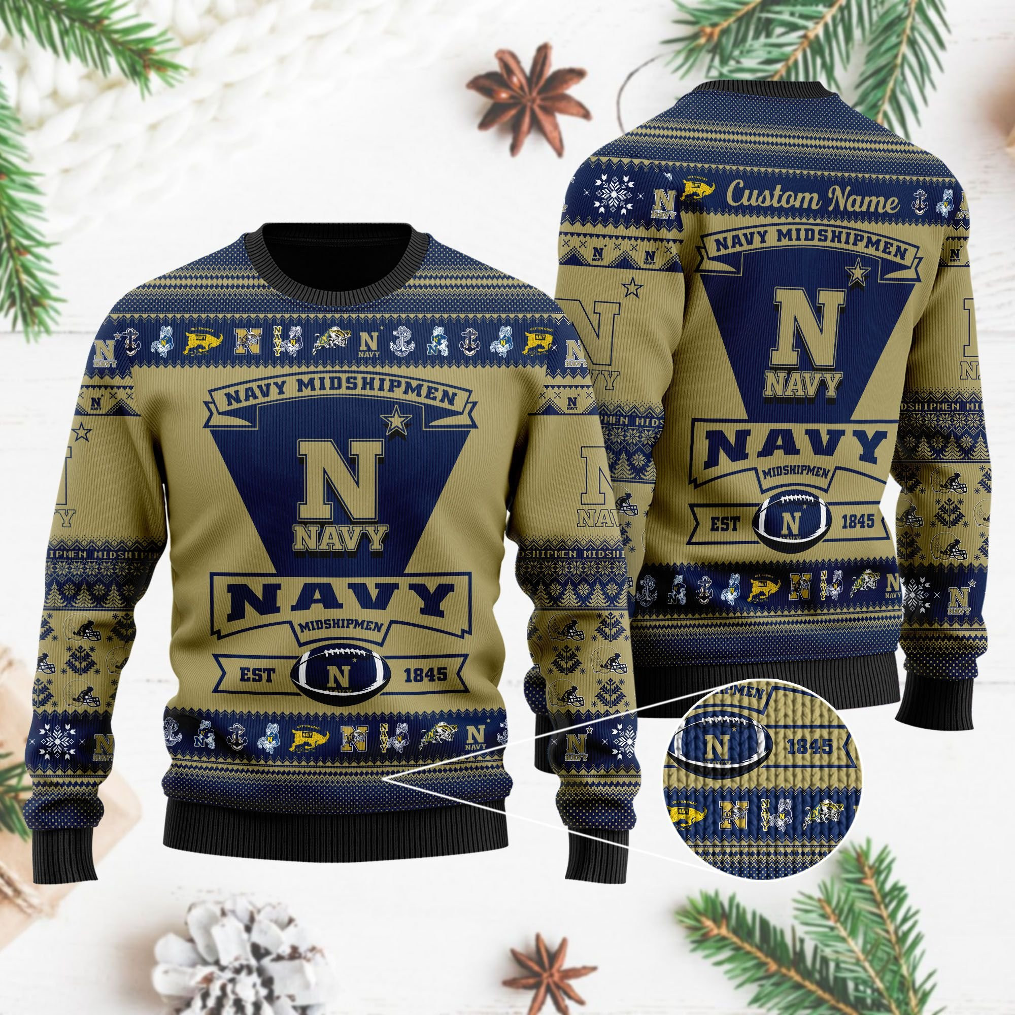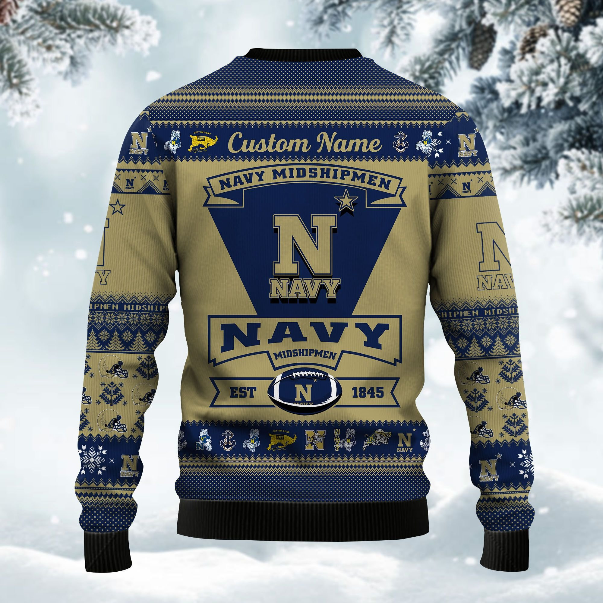 Navy Midshipmen Football Team Logo Custom Name Personalized Ugly Christmas Sweater Perfect Holiday Gift