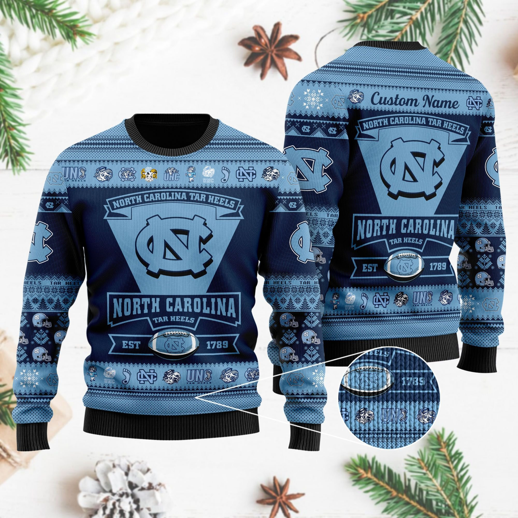 Introducing our eagerly anticipated North Carolina Tar Heels Football Team Logo Personalized Ugly Christmas Sweater, Perfect Holiday Gift 2023 – the pinnacle of festive fashion and a must-have addition to your holiday wardrobe! Carefully crafted from premium polyester, these sweaters not only offer a snug fit but also deliver lasting comfort. Explore a captivating array of holiday-themed designs, meeting the widespread demand for classic motifs, playful characters, and clever slogans.