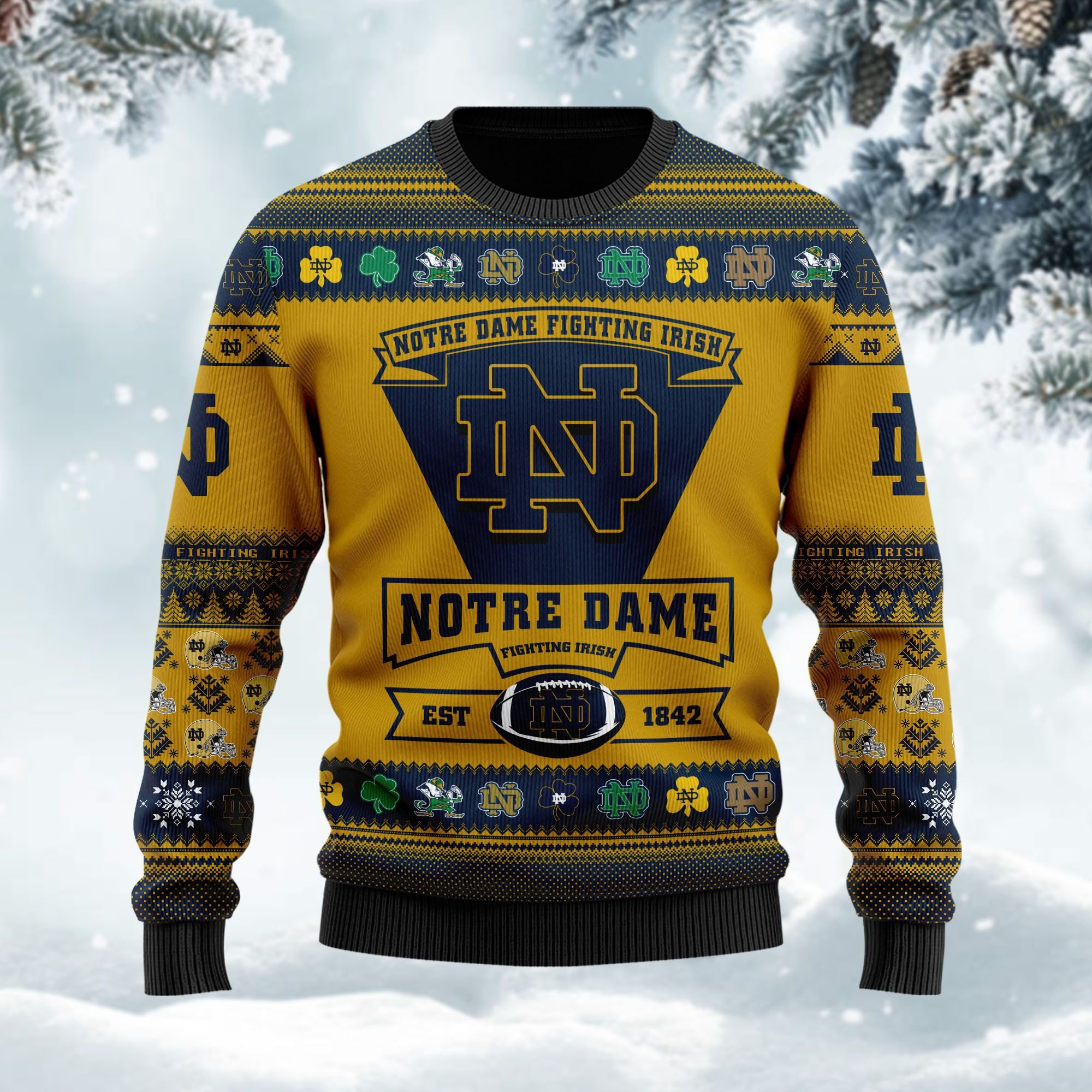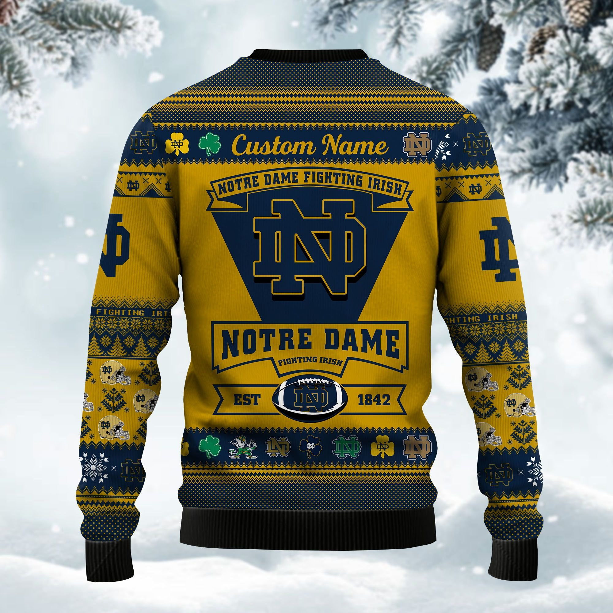 Introducing our eagerly anticipated Notre Dame Fighting Irish Football Team Logo Personalized Ugly Christmas Sweater, Perfect Holiday Gift 2023 – the pinnacle of festive fashion and a must-have addition to your holiday wardrobe! Carefully crafted from premium polyester, these sweaters not only offer a snug fit but also deliver lasting comfort. Explore a captivating array of holiday-themed designs, meeting the widespread demand for classic motifs, playful characters, and clever slogans.