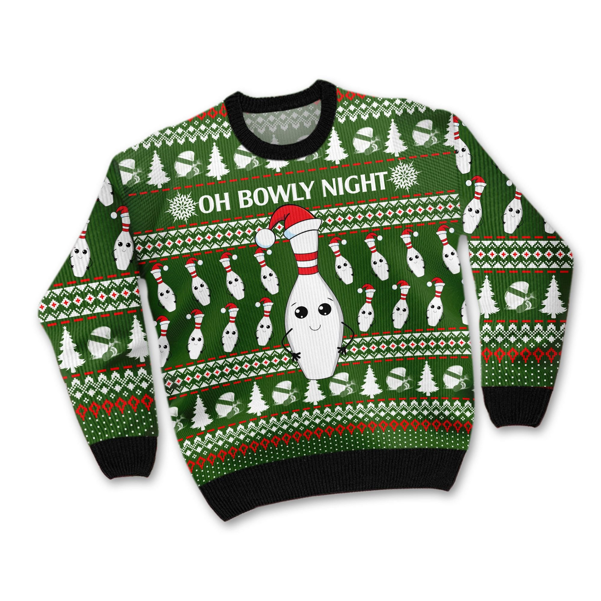 Impress your family and friends with a distinctive blend of style and humor. Our Oh Bowly Night With Christmas Patterns For Bowling And Sport Lovers Ugly Christmas Sweater, Perfect Holiday Gift go beyond mere apparel; they embody a tradition that sparks joy and creates enduring memories. Embrace the festive spirit with these vibrant polyester masterpieces – the perfect choice to make this holiday season memorable for all those seeking festive clothing treasures.