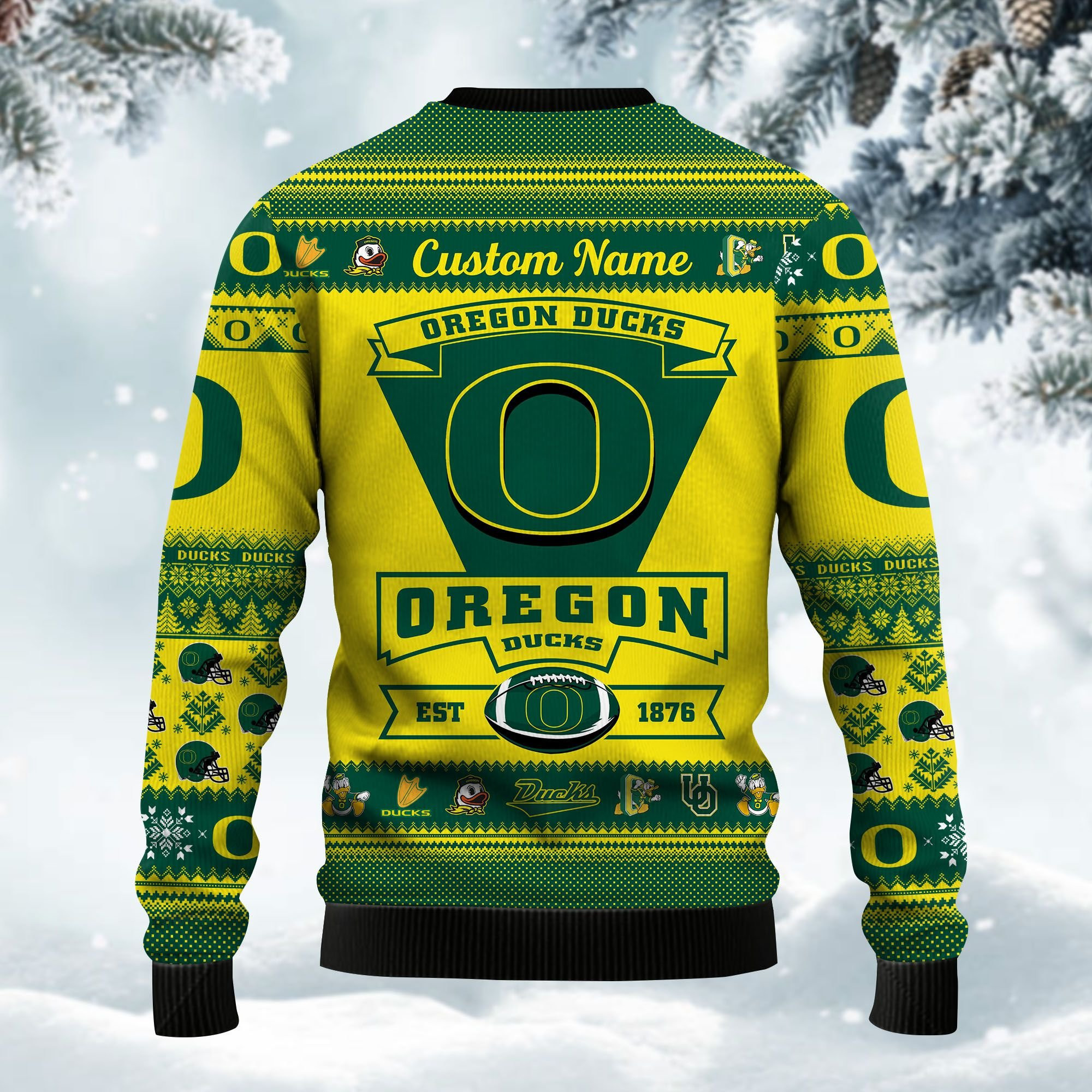 Impress your family and friends with a distinctive blend of style and humor. Our Oregon Ducks Football Team Logo Custom Name Personalized Ugly Christmas Sweater, Perfect Holiday Gift go beyond mere apparel; they embody a tradition that sparks joy and creates enduring memories. Embrace the festive spirit with these vibrant polyester masterpieces – the perfect choice to make this holiday season memorable for all those seeking festive clothing treasures.