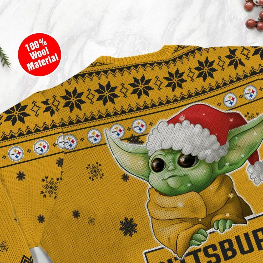 Impress your family and friends with a distinctive blend of style and humor. Our Pittsburgh Steelers Cute Baby Yoda Grogu Holiday Party Ugly Christmas Sweater, Perfect Holiday Gift go beyond mere apparel; they embody a tradition that sparks joy and creates enduring memories. Embrace the festive spirit with these vibrant polyester masterpieces – the perfect choice to make this holiday season memorable for all those seeking festive clothing treasures.