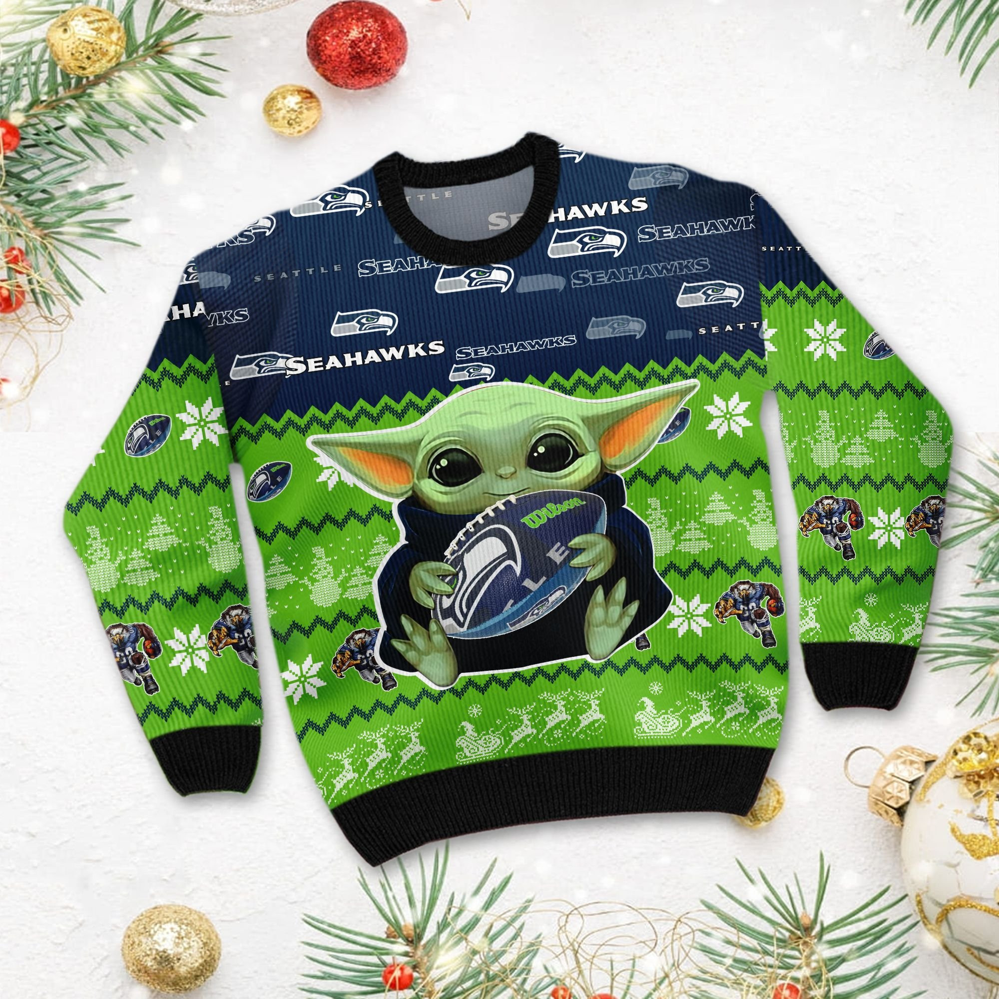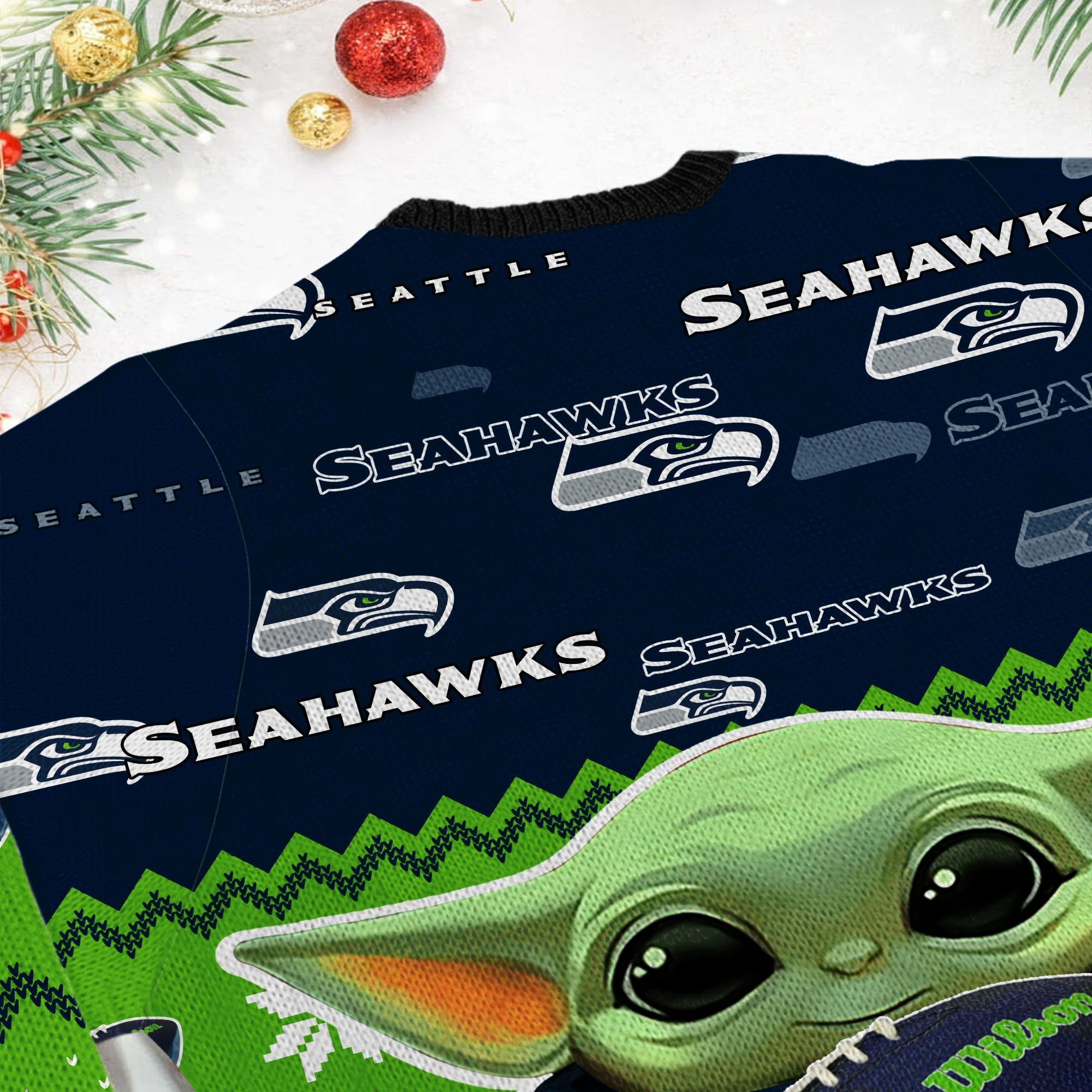 Impress your family and friends with a distinctive blend of style and humor. Our Seattle Seahawks Baby Yoda Shirt For American Football Fans Ugly Christmas Sweater, Perfect Holiday Gift go beyond mere apparel; they embody a tradition that sparks joy and creates enduring memories. Embrace the festive spirit with these vibrant polyester masterpieces – the perfect choice to make this holiday season memorable for all those seeking festive clothing treasures.